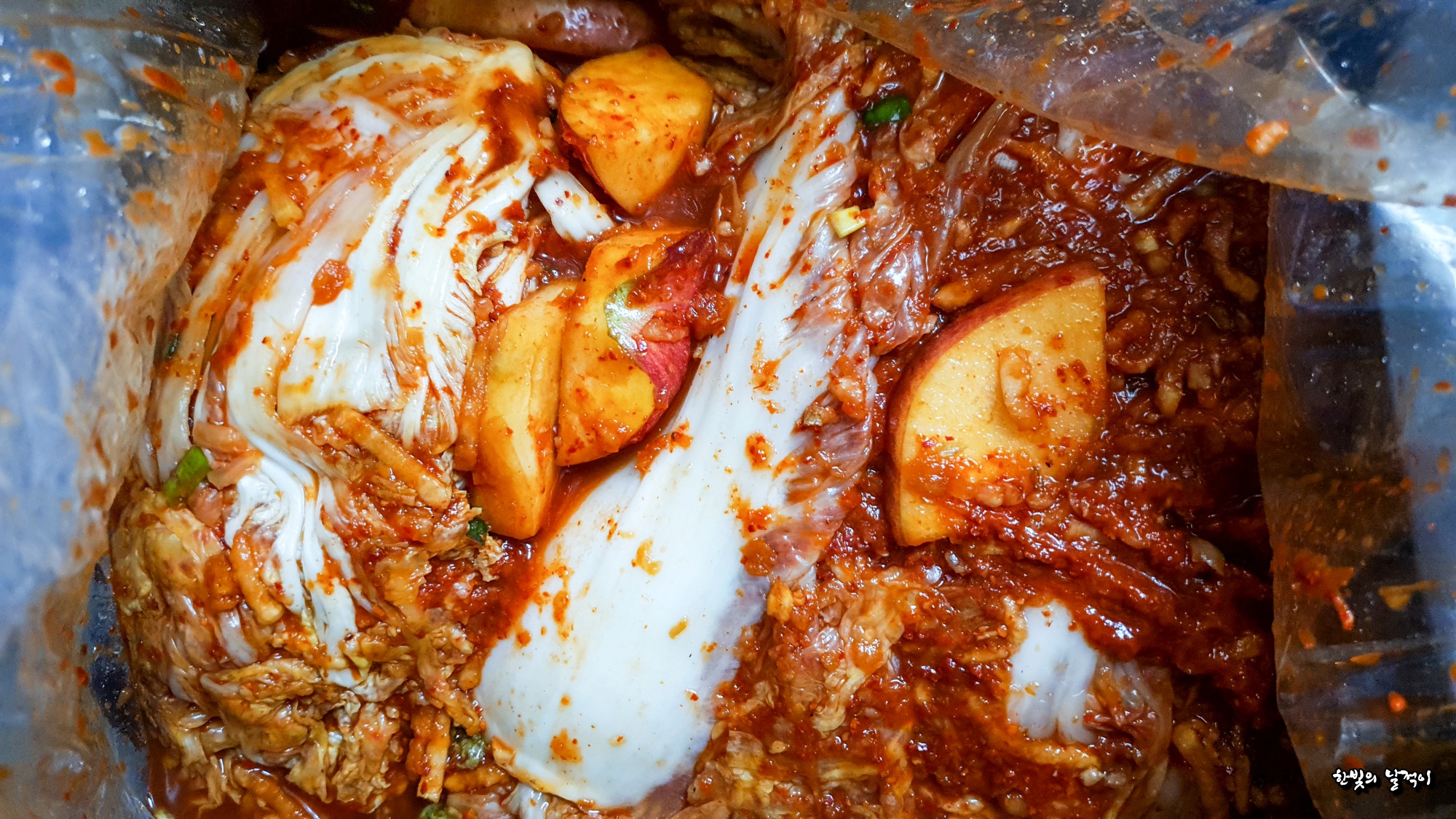 배추부터 소금, 무, 고춧가루, 찹쌀, 양파, 물엿, 사과, 마늘까지 그리고 멸치액젓과 대파, 새우젓, 생각까지 모두 올 국산입니다.