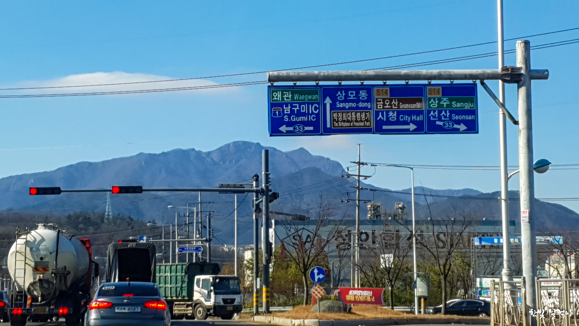 남구미대교를 건너면서 구미 쪽으로 들어가면 바로 저 앞에 보이는 산이 금오산이랍니다.